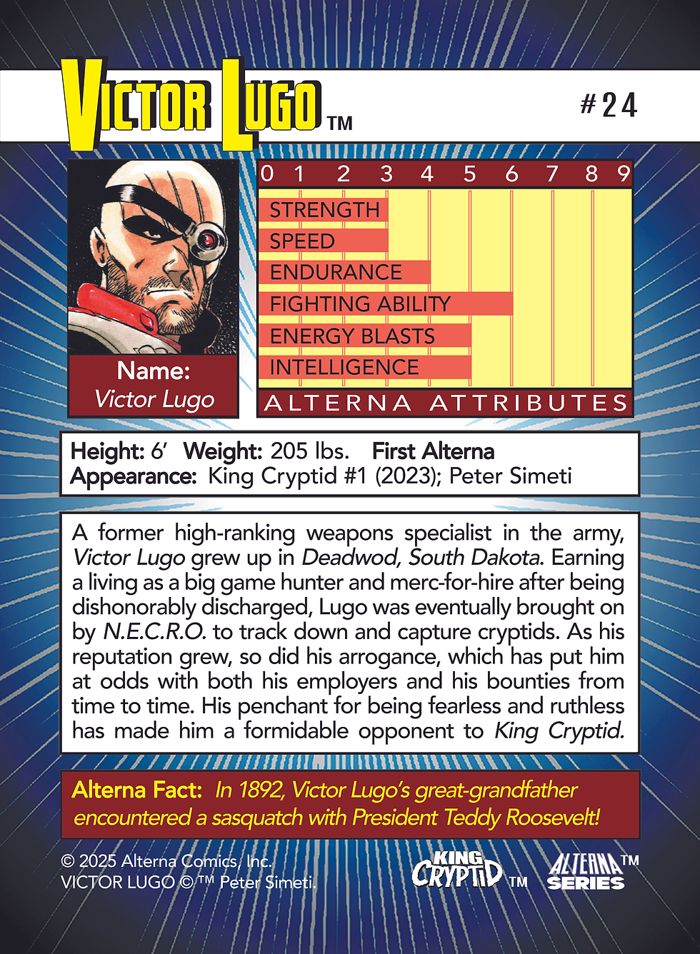 Cursed and transformed centuries ago, King Cryptid is now on a path of redemption as he fights human and inhuman monsters alike. Created by Peter Simeti with art by Kristian Rossi, Nic Hunter, Aleks Jovic, Frankie B. Washington, and Keir Covington.